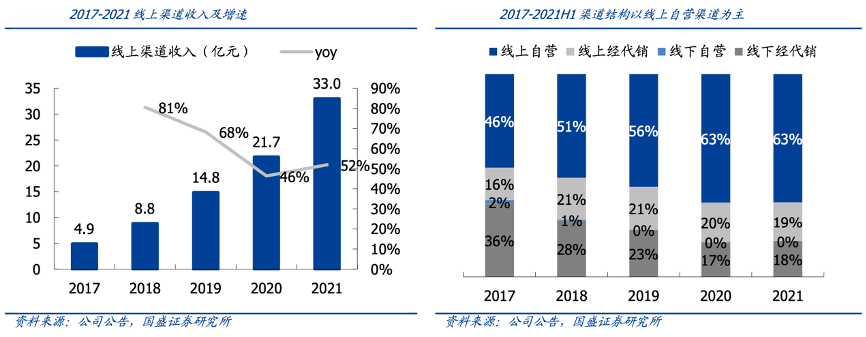 經(jīng)典案例:根據(jù)公司公告、國盛證券研究所等綜合資訊表明,薇諾娜借助線上渠道發(fā)力實(shí)現(xiàn)規(guī)??焖贁U(kuò)張。2018-2021 線上渠道收入增速分別達(dá) 80.6%/68.3%/46.4%/51.9%,2021年公司線上收入 33.0 億元,占比銷售總額達(dá) 82.3%。其中其線上自營在渠道結(jié)構(gòu)中占比過半,以天貓/微信小程序/京 東/網(wǎng)上商城為主,線上分銷以唯品會(huì)/京東/天貓等平臺為主。