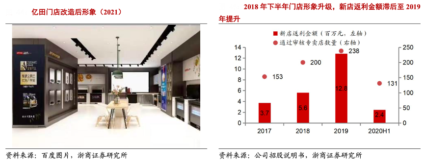 經(jīng)典案例:根據(jù)百度圖片、公司招股說明書、浙商證券研究所等綜合資訊表明,億田公司提升省會城市的返利門檻,從 2017、2018 年的 150 萬調(diào)整為 2019-2020H1 的 200 萬,提高經(jīng)銷商的銷售積極性;同時推進經(jīng)銷商門店升級改造并給予返利支持,截至 2021H1其已完成 800 多家終端門店形象改造升級。