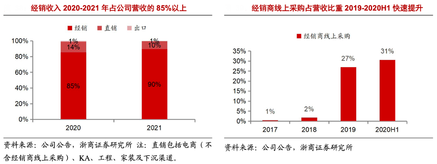 經(jīng)典案例:根據(jù)公司公告、浙商證券研究所等綜合資訊表明,億田智能經(jīng)銷模式為主,經(jīng)銷商線上采購快速發(fā)展。2020-2021年其經(jīng)銷模式分別占營收的 85%、90%,經(jīng)銷包括經(jīng)銷商線上采購及經(jīng)銷商線下采購。其公司2019 年起線上采購收入 占比快速提升,從 2018 年的 2%提升至 2020H1 的 31%,主要是由于公司大力推廣經(jīng)銷商線上采購,并推出線上專供款集成灶。