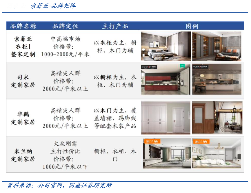 經(jīng)典案例:根據(jù)公司官網(wǎng)、國(guó)盛證券研究所等綜合資訊表明,索菲亞成立于2003年廣州增城,中國(guó)衣柜行業(yè)的先行者,2011 年 A 股上市,成為國(guó)內(nèi)定制家居第一股,2013年開啟大家居戰(zhàn)略,2021年將索菲亞主品牌“柜類定制專 家”升級(jí)為“衣柜|整家定制”。目前,索菲亞戰(zhàn)略定位“整家定制”,多品類、多品牌、全渠道融合發(fā)展。2015-2021 年收入從 31.96 億元提升至 104.07 億元,CAGR 為 21.7%。
