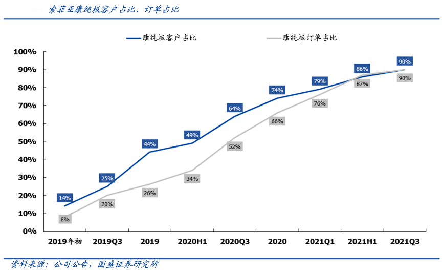 經(jīng)典案例:根據(jù)公司公告、國(guó)盛證券研究所等綜合資訊表明,索菲亞公司板材由 E0 板升級(jí)至零甲醛添加的康純板,2021年9月索菲亞康純地板正式納入國(guó)家孕嬰網(wǎng)體系,成為定制家居唯一入選企業(yè)。2019年至2021Q3,索菲亞康純板客戶占比從 14% 上升至約 90%,訂單占比從 8%上升至約 90%。
