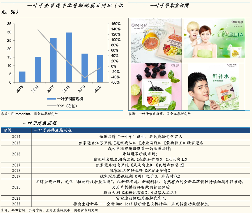 根據(jù)歐睿可獲得的數(shù)據(jù),一葉子于 2015-2017 年實(shí)現(xiàn)高增長(zhǎng),零售額復(fù)合 增速達(dá)到 102%,2016 年成為中國(guó)市場(chǎng)份額第一的面膜品牌。2018 年增速放 緩至 13%、零售規(guī)模接近 30 億元。