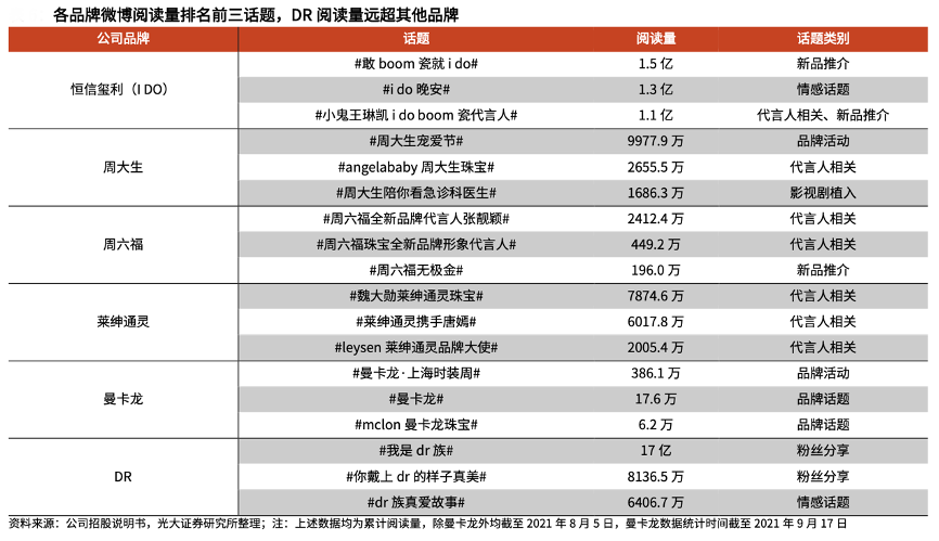 經(jīng)典案例:根據(jù)公司招股說(shuō)明書、光大證券研究所等綜合資訊表明,截至 2021 年 8 月 5 日,在各珠寶品牌微博話題中,DR的“#我是 DR 族#”話題閱讀量共計(jì)達(dá)到 17 億,遠(yuǎn)超其他品牌話題熱度。微博話題上DR粉絲創(chuàng)作發(fā)表的內(nèi)容主要為情感表達(dá),傳播品牌理念,龐大的粉絲基數(shù)與自發(fā)傳播為公司的理念推廣提供了基礎(chǔ)。