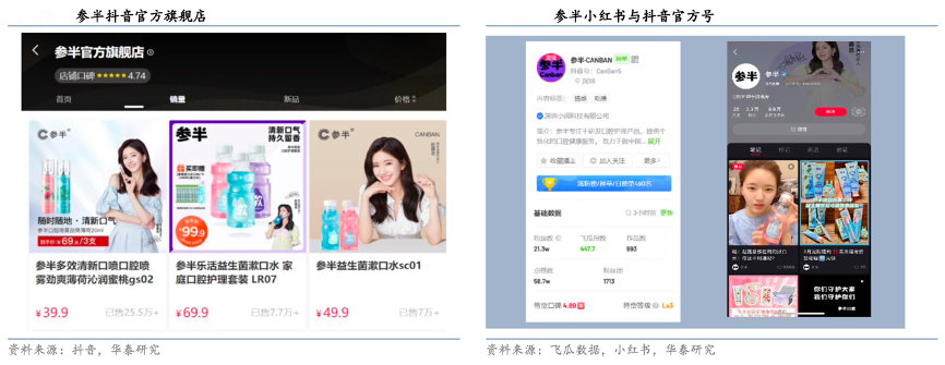 經(jīng)典案例:根據(jù)抖音、飛瓜數(shù)據(jù)、小紅書、華泰研究等綜合資訊表明,參半通過(guò)以下方式進(jìn)行營(yíng)銷:1)明星代言。推出益生菌漱口水前期,參半同時(shí)簽下趙露思、毛不易、沈夢(mèng)辰三位明星對(duì)新品進(jìn)行宣發(fā)。2)覆蓋新社交媒體。參半聯(lián)合 B 站、小紅書、抖音等平臺(tái)粉絲過(guò)萬(wàn)的腰部、中部網(wǎng)紅達(dá)人, 進(jìn)行產(chǎn)品種草,做新潮內(nèi)容投放。據(jù)抖音站內(nèi) 3 月 28 日搜索數(shù)據(jù),近 30 天 參半品牌關(guān)聯(lián)直播 3108 場(chǎng),關(guān)聯(lián)視頻 5346 個(gè),抖音銷售額 2482 萬(wàn)元。