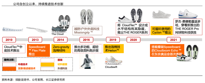 經(jīng)典案例:根據(jù)招股說(shuō)明書、公司官網(wǎng)、長(zhǎng)江證券研究所等綜合資訊表明,On Running(On/昂跑)致力于改善跑步體驗(yàn),CloudTec 中底技術(shù)+Speedboard+HelionTM Superfoam 泡棉材料構(gòu)成公司產(chǎn)品核心特色。