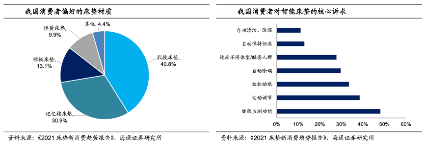 經(jīng)典案例:根據(jù)《2021 床墊新消費(fèi)趨勢報告》、海通證券研究所等綜合資訊表明,隨著人們對生活質(zhì)量要求的提高,睡感偏硬、易變型的彈簧床墊逐漸失去吸引力,根據(jù)《2021床墊新消費(fèi)趨勢報告》,分別有 40.8%、30.9% 的消費(fèi)者偏愛乳膠、記憶棉材質(zhì)的床墊。另外,有 48.1%的受訪者希望智能床墊具有睡 眠時健康檢測功能。