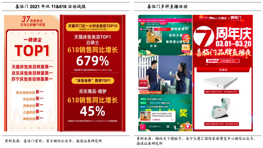 經(jīng)典案例:根據(jù)喜臨門官網(wǎng)、官方微信公眾號、暢玩天下搜狐號、南寧大商匯國際家居博覽中心微信公眾號、、海通證券研究所等綜合資訊表明,喜臨門自 2020 年 3 月以來高頻探索直播渠道,從千人導(dǎo)購抖音種草直播、區(qū)域團(tuán)購會直播、聯(lián)合頭部主播到總裁直播,流量裂變已顯成效,2020 年 11 月總裁楊剛先生進(jìn)行直播,吸引 35 萬多人參與互動。