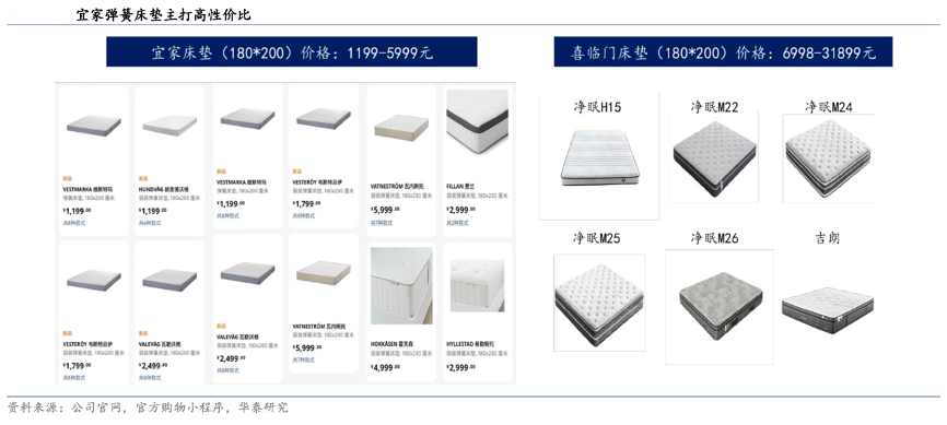 以床墊為例,宜家官方商場共提供 12 款 180cm×200cm 規(guī)格的彈 簧床墊,價格區(qū)間集中在 1199 元/張-5999 元/張,對標(biāo)國內(nèi)床墊龍頭喜臨門,旗下凈眠系 列彈簧床墊(180cm×200cm)終端售價在 6998 元/張-31899 元/張,喜臨門凈眠系列主要 定位中高端消費群體,而宜家千元級床墊性價比突出,距離年輕消費者更近一步。