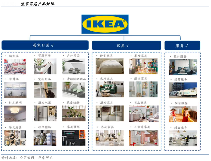 經(jīng)典案例:根據(jù)公司官網(wǎng)、華泰研究等綜合資訊表明,宜家可為消費者提供的產(chǎn)品品類包括床及床墊、沙發(fā)坐具、儲物收納、餐具廚房、浴室用品、櫥柜家電、嬰童用品乃至紡織品、清潔晾曬、寵物用品等 20 多個大類,應(yīng)用區(qū)域覆蓋客廳、臥室、廚房、餐廳、兒童房、浴室、書房乃至戶外陽臺等全家居場景,產(chǎn)品總 SKU 數(shù)量接近萬個。相較傳統(tǒng)家居品牌專注于特定品類的經(jīng)營模式,宜家豐富的產(chǎn)品矩陣,配合大店店態(tài)及場景化布局,可滿足消費者一站式家居用品采購需求,建立起了強大的產(chǎn)品優(yōu)勢。