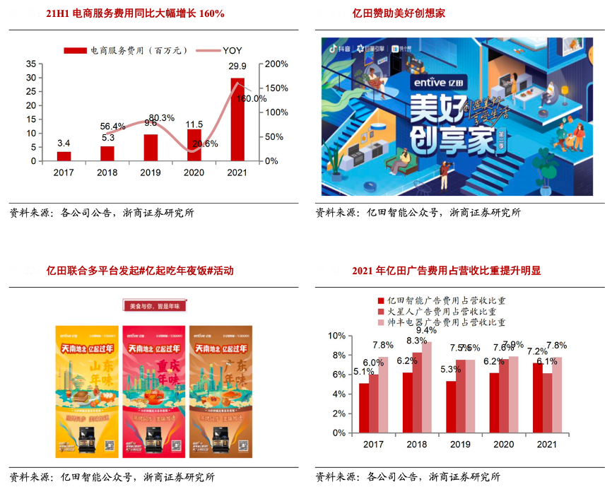 經(jīng)典案例:根據(jù)億田智能公眾號(hào)、各公司公告、浙商證券研究所等綜合資訊表明,2021年起億田公司加大電商投入,電商服務(wù)費(fèi)用同比大幅增長(zhǎng) 160%。同時(shí),公司側(cè)重投放媒介結(jié)構(gòu)的優(yōu)化,互聯(lián)網(wǎng)新媒體的投放占比不斷提高,2021 年 9 月億田贊助由央視、抖音、巨量引擎等聯(lián)合推出的《美好創(chuàng)享家》節(jié)目;2022 年 1 月億田聯(lián)合小紅書(shū)、知乎、微博等平臺(tái)發(fā)起#億起吃年夜飯#活動(dòng),用集成灶烹 飪經(jīng)典 5 大菜系年夜飯,展現(xiàn)集成灶產(chǎn)品優(yōu)勢(shì)。