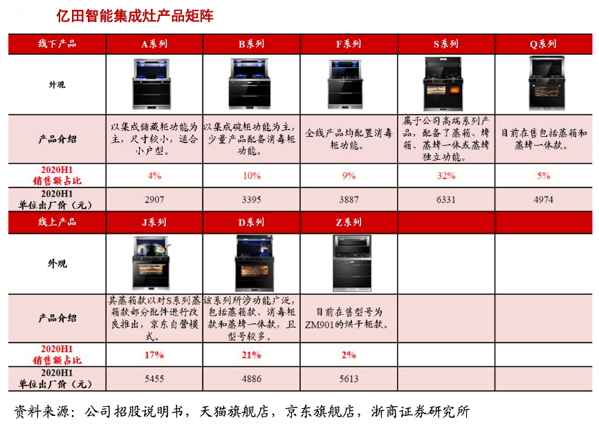 經(jīng)典案例:根據(jù)億田智能公眾號(hào)、浙商證券研究所等綜合資訊表明,億田智能公司集成灶產(chǎn)品按定位分為小戶型款、經(jīng)濟(jì)適用款、高端款和電商渠道款。小戶型及經(jīng)濟(jì)適用款系公司早期推出的功能單一的產(chǎn)品,包括 A、B、F 系列,配備儲(chǔ)藏柜、碗柜和消毒柜,20H1出廠均價(jià)在 4000 元以下,20H1 收入貢獻(xiàn)在 10%及以下;S 系列為公司高端系列產(chǎn)品,配備蒸箱、烤箱或蒸烤一體功能,20H1 出廠均價(jià)達(dá)到 6331 元,20H1 收入貢獻(xiàn)達(dá)到 32%。