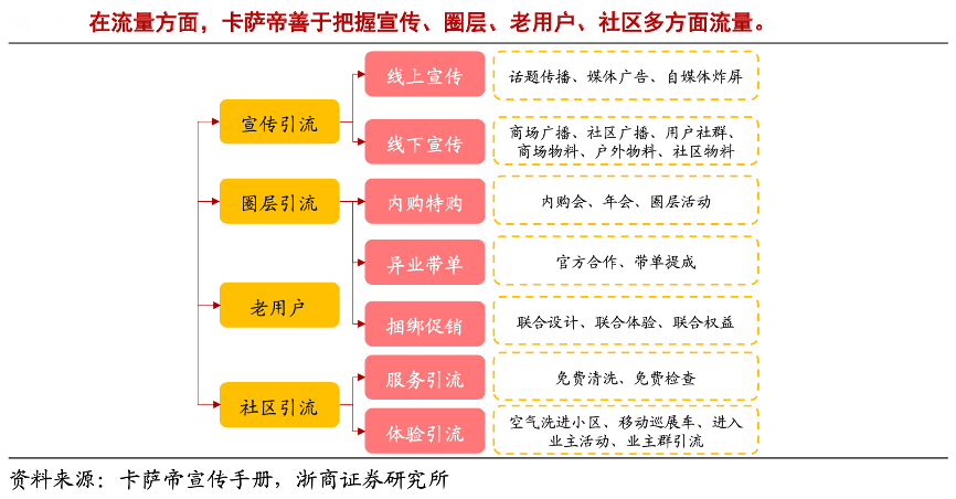 經(jīng)典案例:根據(jù)卡薩帝宣傳手冊、浙商證券研究所等綜合資訊表明,卡薩帝的營銷引流方式分為宣傳引流、圈層引流、老用戶引流和社區(qū)引流四種方式。其積極擁抱線上自媒體,通過抖音短視頻、微信話題進行營銷,在線下渠道除了傳統(tǒng)的物料宣傳,卡薩帝聯(lián)合居委會通過社區(qū)傳播。針對不同的圈層采取聯(lián)合設(shè)計、官方合作等方式有針 對性地進行營銷。為老用戶提供免費上門清潔等服務(wù),定期舉辦老用戶回饋 活動,通過老用戶的口碑邀請新用戶。同時卡薩帝進入社區(qū)年會,舉辦業(yè)主答謝會,并為社區(qū)消費者講解加點難題,宣傳卡薩帝促銷節(jié)點的購機權(quán)益。