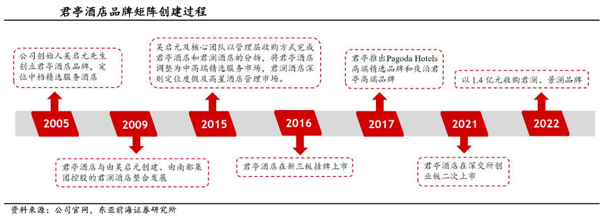 經(jīng)典案例:根據(jù)公司官網(wǎng)、東亞前海證券研究所等綜合資訊表明,2017年,君亭豐富品牌矩陣,推出 Pagoda Hotels 高端精選品牌和夜泊君亭高端品牌,提升品牌調(diào)性。2022 年 1 月 21 日,君亭酒店以 1.4 億收購君瀾79%股權(quán)和景瀾70%股權(quán),持續(xù)推進(jìn)高端化布局。