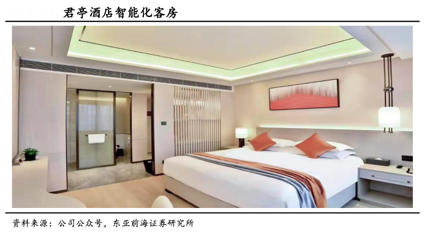 經(jīng)典案例:根據(jù)公司公眾號(hào)、東亞前海證券研究所等綜合資訊表明,君亭酒店充分融合物聯(lián)網(wǎng)技術(shù)對(duì)酒店客房的家電、家具、燈光、公共區(qū)域視頻監(jiān)控等實(shí)現(xiàn)智能控制,目前旗下部分酒店已率先實(shí)現(xiàn)智慧酒店場(chǎng)景建設(shè),例如住宿客人可以根據(jù)喜好智能調(diào)節(jié)客房燈光、溫度、窗簾開關(guān)、多媒體設(shè)備操作等,與阿里未來酒店合作在部分酒店加裝智能電子感應(yīng)門鎖,注重于客戶的互動(dòng)方式與 個(gè)性化體驗(yàn)的提升。