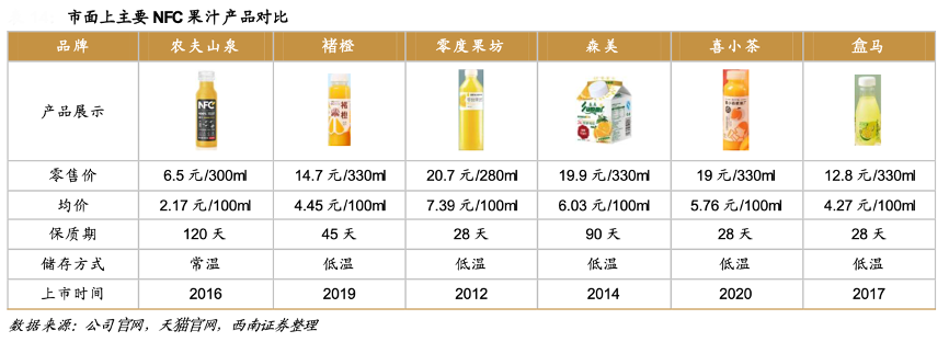 經(jīng)典案例:根據(jù)公司官網(wǎng)、天貓官網(wǎng)、西南證券等綜合資訊表明,農(nóng)夫山泉NFC果汁系列在2008年開始前瞻性布局,經(jīng)歷多年技術(shù)改進(jìn),陸續(xù)解決原料品質(zhì)、臍橙榨汁苦味、無菌罐裝、常溫儲(chǔ)存等一系列技術(shù)難題,于2016年正式推出常溫NFC橙汁產(chǎn)品,可常溫保存 120 天,是目前市面上保存時(shí)間最長(zhǎng)的 NFC 果汁,形成較高的技術(shù)壁壘。