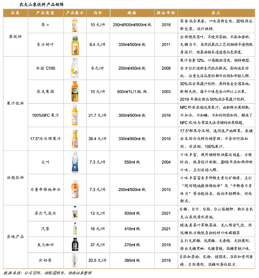 經(jīng)典案例:根據(jù)公司官網(wǎng)、招股說明書、西南證券等綜合資訊表明,農(nóng)夫山泉公司積極拓展“非水類產(chǎn)品”,其“SODA”系列蘇打天然水飲品,一方面選用公司優(yōu)質(zhì)天然水源地的優(yōu)質(zhì)天然水為原料,在蘇打水市場(chǎng)中具有差異化競(jìng)爭(zhēng)優(yōu)勢(shì),另一方面作為“近水類”飲品,能夠更好享受公司包裝飲用水的渠道協(xié)同效應(yīng)。