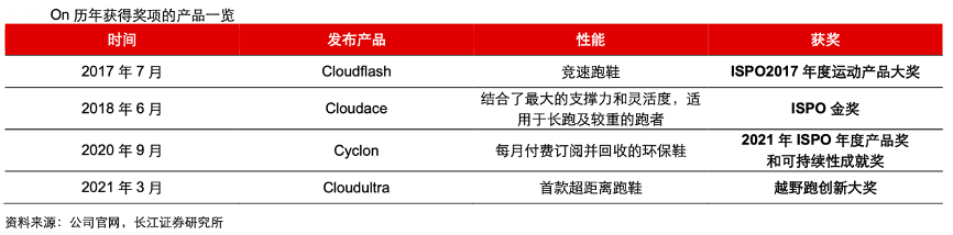 經(jīng)典案例:根據(jù)公司官網(wǎng)、長(zhǎng)江證券研究所等綜合資訊表明,2011 年,瑞士聯(lián)邦理工學(xué)院(ETH)發(fā)布研究結(jié)果表明,穿著 On 的跑者在測(cè)試中的脈搏率和血乳酸水平明顯較低。2014年, On 入選《跑者世界》在美國(guó)、英國(guó)及德國(guó) 20 大最重要跑鞋榜單,2015年 2 月 On Cloud 榮獲 2015/2016ISPO 全球設(shè)計(jì)大賽最佳運(yùn)動(dòng)表現(xiàn)金獎(jiǎng)。