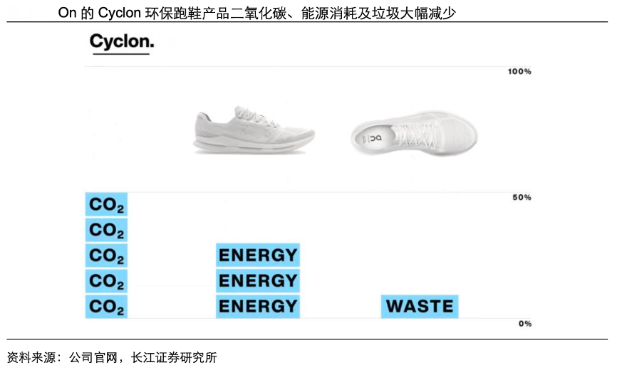 經(jīng)典案例:根據(jù)公司官網(wǎng)、長(zhǎng)江證券研究所等綜合資訊表明,On 在其成立一個(gè)月后就獲得了 ISPO(唯一 面向全球運(yùn)動(dòng)行業(yè)產(chǎn)品的權(quán)威評(píng)選)新品牌獎(jiǎng)。同時(shí),On的Cyclon環(huán)保跑鞋產(chǎn)品二氧化碳、能源消耗及垃圾大幅減少。