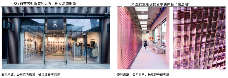 經(jīng)典案例:根據(jù)公司官方微博、公司官網(wǎng)、長(zhǎng)江證券研究所等綜合資訊表明,On旗艦店和自營(yíng)店主要起梳理品牌形象和培育消費(fèi)者品牌認(rèn)知的作用,adw 選址位于核心商圈且店鋪形象簡(jiǎn)約,并以新零售體驗(yàn)向消費(fèi)者傳遞品牌的科技概念,如紐約旗艦店的“魔法墻”實(shí)時(shí)掃描購(gòu)物者的跑步風(fēng)格,以幫助他們找到適合其跑步風(fēng)格和需求的鞋款。
