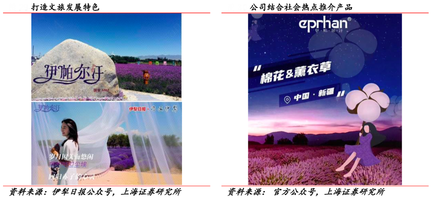 經(jīng)典案例:根據(jù)伊犁日報(bào)公眾號、官方公眾號、上海證券研究所等綜合資訊表明,伊帕爾汗線下簽約數(shù)十家 CS 渠道代理商,線上布局多個新媒體平臺和電商平臺,通過直播、社群、福瑞達(dá)DTC品牌集群等渠道來進(jìn)行拓展。線下與新疆農(nóng)業(yè)、文旅部門等緊密合作,結(jié)合中國新疆產(chǎn)地優(yōu)勢塑造品牌特色,以中 國薰衣草原產(chǎn)地溯源性標(biāo)簽的 4A 級景區(qū)形象,通過線上文旅資源云展和線下制造業(yè)展播,打造薰衣草文旅融合雙發(fā)展。