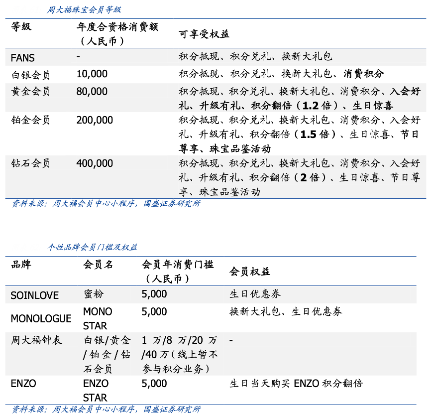 經典案例:根據(jù)周大福會員中心小程序、國盛證券研究所等綜合資訊表明,周大福公司為會員準備了專屬福利,會員可受邀參加 Good Living Plus(GLP+)會員計劃,以享受額外的獎賞優(yōu)惠,包括在與公司合作的商戶取得休閑、酒店與旅游優(yōu)惠。此外,客戶按照消費金額可享受不同級別的會員計劃,隨著會員級別的升高,會員將享有更多權利,包括積分抵現(xiàn)、積分翻倍、生日驚喜、節(jié)日尊享等,“鉑金會員”及“鉆石 會員”還有機會參與公司組織的線下高端沙龍和高端珠寶拍賣會活動。與此同時,顧客通過在個性化品牌店消費還可以獲得個性品牌專屬會員。