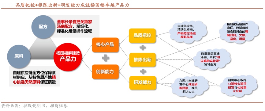 經典案例:根據招股說明書、招商證券等綜合資訊表明,為打破消費者對于麻辣燙的刻板印象,楊國福公司以健康為價值觀核心,創(chuàng)新性地在麻辣燙湯底中加入全脂奶粉以及牛骨粉等營養(yǎng)成分,為人體穩(wěn)定提供鈣元素、脂肪、維生素、礦物質等人體必需的微量元素,研發(fā)出“可以喝的麻辣燙”的獨特配方。此外,其還堅持順應市場趨勢優(yōu)化現有配方并進行產品推陳出新,分別于 2019 年 6 月以及 2020 年 5 月推出了“番茄麻辣湯”以及“醇香麻辣燙”兩大湯底,進一步豐富了其產品矩陣。