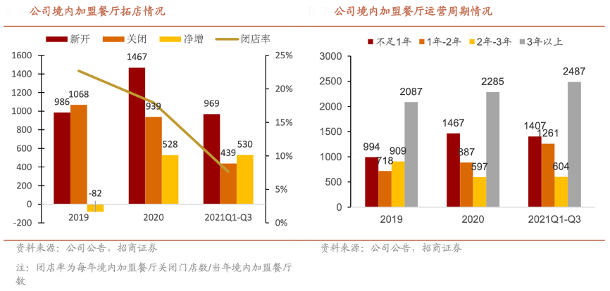 經典案例:根據公司公告、招商證券等綜合資訊表明,疫情期間楊國福公司開店節(jié)奏加快,閉店率大幅度下滑,近四成以上加盟餐廳運營周期超過 3 年。2019-2020 年及 2021 年 Q1-Q3 其公司新開門店 986 家/1467 家/969 家,關閉門店 1068 家/939 家/439 家,目前公司已經與部分 加盟商建立穩(wěn)定長期穩(wěn)固的合作關系,4 成以上加盟餐廳運營周期超過 3 年。