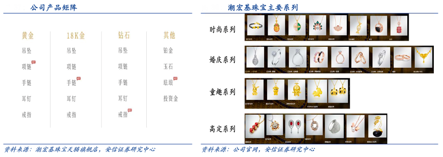 經(jīng)典案例:根據(jù)潮宏基珠寶天貓旗艦店、公司官網(wǎng)、安信證券研究中心等綜合資訊表明,潮宏基消費群體偏年輕,且悅己需求占比較大,其品牌已經(jīng)形成了時尚、婚慶、童趣和高定四大系列來滿足不同客群的需求。每個系列下包含吊墜、項鏈、手鏈、戒指、耳飾、手鐲、串珠這七大品類;材質(zhì)上除了主推的 K 金外,涵蓋黃金、鉆石、鉑金、珍珠以及彩寶等。以各大珠寶品牌的天貓旗艦店為例,2022 年 3 月潮宏基珠寶 SKU 達 2667 個,僅次于周大福位居行業(yè)第二。
