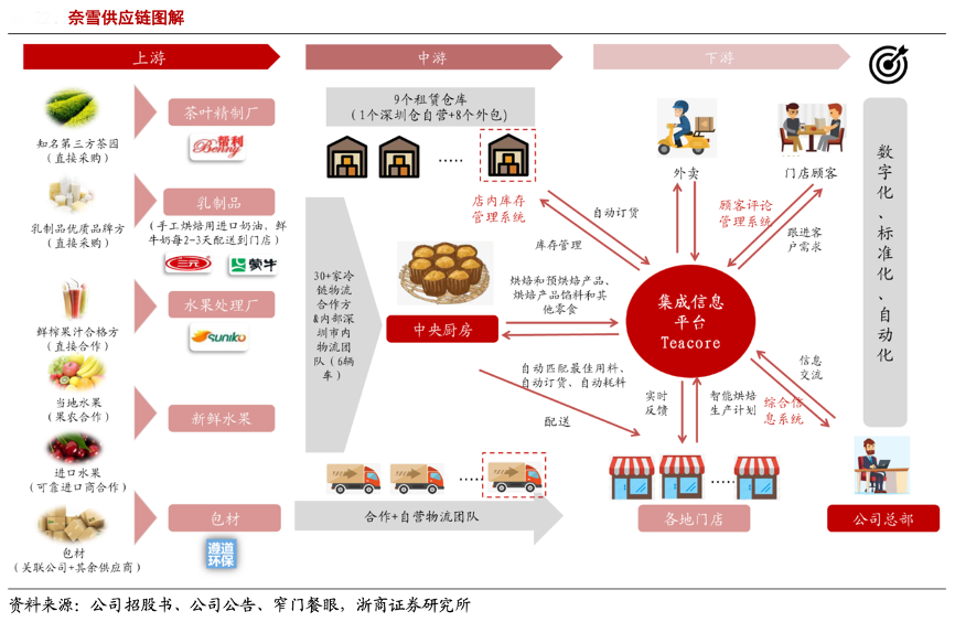 經(jīng)典案例:根據(jù)公司招股書、公司公告、窄門餐眼、浙商證券研究所等綜合資訊表明,在上游方面,奈雪公司尤為重視原材料的采購,以合作+自建形式確保產(chǎn)品品質(zhì),甄選優(yōu)質(zhì)供應(yīng)商不斷優(yōu)化原材料成本。在中游方面,公司構(gòu)建中央廚房網(wǎng)絡(luò)。在下游方面,奈雪通過自研供應(yīng)鏈和數(shù)字運(yùn)營系統(tǒng)實(shí)現(xiàn)從供應(yīng)商到倉、運(yùn)、配、生產(chǎn)等全環(huán)節(jié)標(biāo)準(zhǔn)化,開展數(shù)字化門店管理,實(shí)現(xiàn)原材料自動訂貨補(bǔ)貨、員工自動排班、優(yōu)化操作動線設(shè)計(jì)、優(yōu)化茶飲制作標(biāo)準(zhǔn)流程等精細(xì)化運(yùn)營措施。