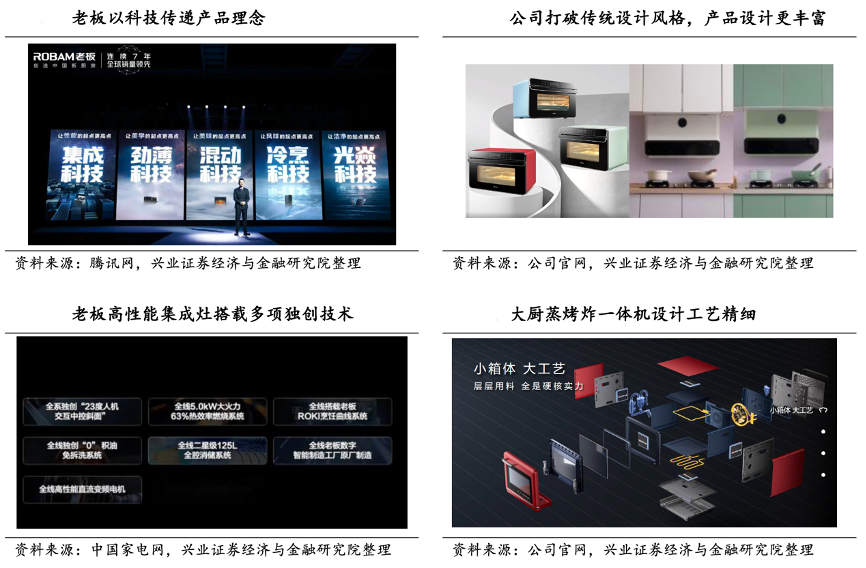 經(jīng)典案例:根據(jù)騰訊網(wǎng)、中國家電網(wǎng)、公司官網(wǎng)、興業(yè)證券經(jīng)濟(jì)與金融研究院等綜合資訊表明,老板公司擁有國家級技術(shù)中心、國家級實驗室、國家級工業(yè)設(shè)計中心以及美國加州和深圳兩地的創(chuàng)新研究院,研發(fā)設(shè)計實力雄厚。其通過“技術(shù)迭代+設(shè)計創(chuàng)新+營銷造勢”的組合拳打造差異化產(chǎn)品。如代表公司“集成技術(shù)”的新一代高性能集成灶產(chǎn)品搭配了“23度人機(jī)交互中控斜面”、“0 積油 免拆洗系統(tǒng)”等多項獨創(chuàng)技術(shù),成為公司打開集成灶市場的拳頭產(chǎn)品。