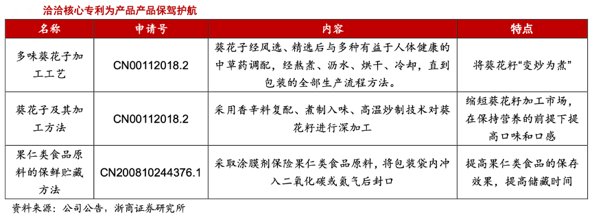經(jīng)典案例:根據(jù)公司公告、浙商證券研究所等綜合資訊表明,結(jié)合企查查數(shù)據(jù),截止到 2022 年洽洽食品一共申請了包括葵花子、西瓜子加工工藝和全自動炒鍋、薯片面片滾紋裝置等 344 項專利。堅果利用鍍鋁包裝+干燥劑+脫氧劑+充氮技術(shù)造就袋內(nèi)氧氣含量小于 1%的保鮮包裝,并于 2018 年榮獲國家“國家科學(xué)技術(shù)進步獎二等獎”。