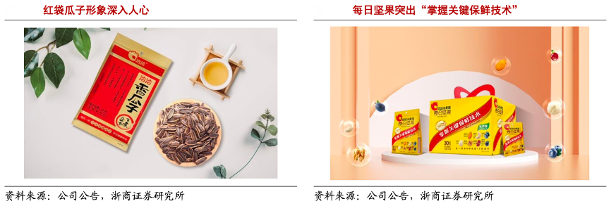 經(jīng)典案例:根據(jù)公司公告、浙商證券研究所等綜合資訊表明,洽洽發(fā)展早期通過央視投放廣告的方式將“不上火、不臟手“的產(chǎn)品特點傳達給全國消費者,紅色牛皮紙包裝沿用至今使得消費者一看到包裝就能想到洽洽,建立起消費者對公司產(chǎn)品的具象化認知;同時其堅果業(yè)務(wù)在產(chǎn)品包裝和營銷上都突出“掌握關(guān)鍵保鮮技術(shù)”的口號,滿足消費者對健康和營養(yǎng)的需求。