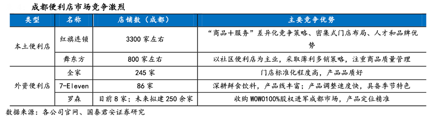 經(jīng)典案例:根據(jù)各公司官網(wǎng)、國(guó)泰君安證券研究等綜合資訊表明,目前紅旗連鎖公司在成都大市內(nèi)的競(jìng)爭(zhēng)對(duì)手主要來(lái)自舞東方等定位相似的本土便利店,以及以日本三家知名便利品牌為代表的外資便利店。面對(duì)日益激烈的競(jìng)爭(zhēng)格局,紅旗連鎖提前布點(diǎn),覆蓋城市的黃金地段或預(yù)計(jì)具有良好發(fā)展?jié)摿Φ纳倘?、社區(qū)商業(yè)中心、交通樞紐,已建立較高進(jìn)入壁壘。密集的門(mén)店網(wǎng)絡(luò)有助于其在營(yíng) 銷(xiāo)推廣、倉(cāng)儲(chǔ)物流等方面產(chǎn)生良好的協(xié)同效應(yīng),從而降低公司的經(jīng)營(yíng)成本。