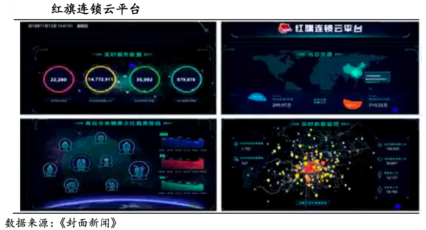 經(jīng)典案例:根據(jù)《封面新聞》、國(guó)泰君安證券研究等綜合資訊表明,由紅旗連鎖公司自主研發(fā)的紅旗云大數(shù)據(jù)平臺(tái)于 2017 年 6 月正式啟動(dòng),將門(mén)店、總部、配送實(shí)時(shí)聯(lián)網(wǎng),平臺(tái)可以實(shí)時(shí)顯示會(huì)員人數(shù)、進(jìn)店人數(shù)、客單價(jià)、當(dāng)天配送中心訂單數(shù)等多 維度數(shù)據(jù)。同時(shí)其對(duì)消費(fèi)行為進(jìn)行更精準(zhǔn)的分析,從而更好的進(jìn)行門(mén)店管理與商品結(jié)構(gòu)優(yōu)化。譬如,紅旗連鎖 2017 年有 22000 多個(gè)單品,通過(guò)數(shù)據(jù)分析淘汰了 7000 多個(gè)。
