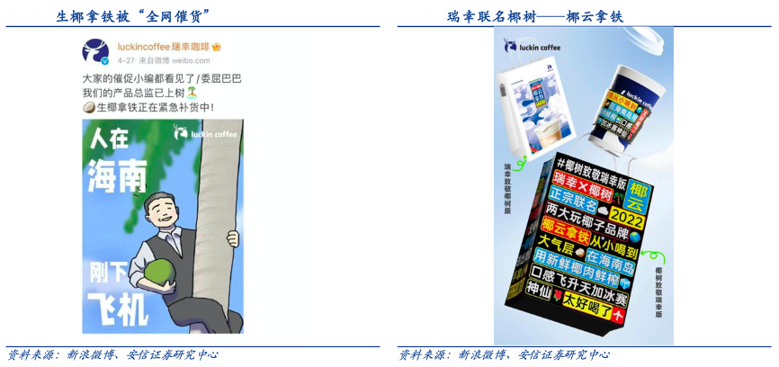 經(jīng)典案例:根據(jù)新浪微博、安信證券研究中心等綜合資訊表明,瑞幸于 2021 年 4 月推出爆款產(chǎn)品生椰拿鐵,同年 9 月,瑞幸又上線新品絲絨拿鐵,9 天賣出 270 萬杯。2022 年 4 月,瑞幸和椰樹聯(lián)名的新品椰云 拿鐵上線,產(chǎn)品設(shè)計保留了椰樹一貫的“設(shè)計界泥石流”PPT 風(fēng)格,網(wǎng)友紛紛用椰云拿鐵模仿椰樹經(jīng)典廣告 pose,瑞幸又一次引爆網(wǎng)絡(luò)。