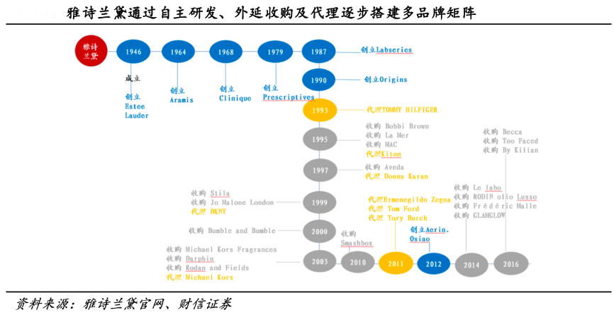 經(jīng)典案例:根據(jù)雅詩蘭黛官網(wǎng)、財信證券等綜合資訊表明,集團(tuán)在創(chuàng)立之初僅有雅詩蘭黛這一單個品牌,在雅詩蘭黛在全球市場具備一定規(guī)模后,便開始自主研發(fā)品牌,先后孵化出 Armis、 倩碧等品牌,至今集團(tuán)體內(nèi)擁有 6 個內(nèi)生孵化的品牌,定位覆蓋男士護(hù)膚、皮膚科護(hù) 膚、天然護(hù)膚等。同時其在 1995 年、2014 年、2016 年三個時間段內(nèi),集團(tuán)按需收購以補(bǔ)充細(xì)分領(lǐng)域,收購的 15 個品牌定位于彩妝、護(hù)發(fā)、香氛、面膜、功效護(hù)膚品等不同賽道上。