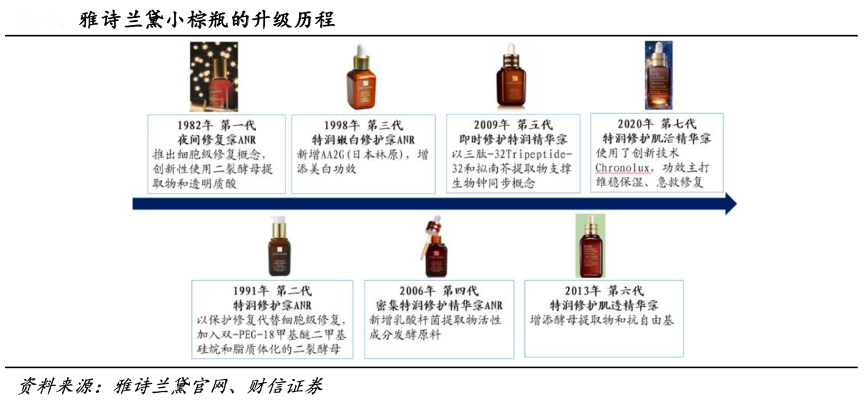 經(jīng)典案例:根據(jù)雅詩蘭黛官網(wǎng)、財信證券等綜合資訊表明,從小棕瓶的升級歷程來看,小棕瓶的前后七次迭代中經(jīng)歷了五次加法,每 一次加法均添加具有新功效的發(fā)酵原料以不斷完善整體修復(fù)力,與之同時公司亦會開 創(chuàng)新概念,小棕瓶已從最開始的“細(xì)胞修護(hù)”逐步進(jìn)階至“DNA 修護(hù)”、“晝夜節(jié)律同 步修護(hù)”、“細(xì)胞自噬修護(hù)”、“信源技術(shù)修護(hù)”。