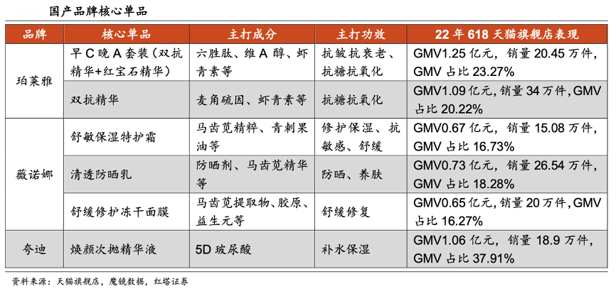 經(jīng)典案例:根據(jù)天貓旗艦店、魔鏡數(shù)據(jù)、紅塔證券等綜合資訊表明,薇諾娜的大單品舒敏保濕特護(hù)霜以馬齒莧、青刺果等云南特色植物提取物為有效成分,適宜專業(yè)敏感肌護(hù)理。而夸迪憑借“全球第 一大玻尿酸供應(yīng)商”IP,打造核心單品煥顏次拋精華液,2022 年 618 期間該 產(chǎn)品在天貓旗艦店實(shí)現(xiàn) GMV1.06 億元,銷量 18.9 萬件,GMV 占比 37.91%。