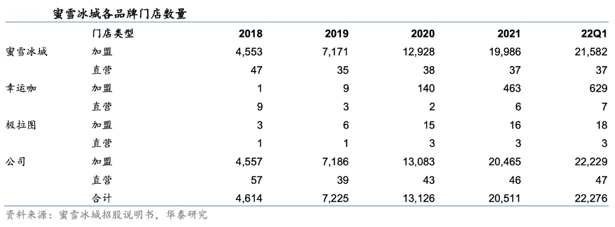 經(jīng)典案例:根據(jù)蜜雪冰城招股說(shuō)明書(shū)、華泰研究等綜合資訊表明,蜜雪冰城公司以直營(yíng)為引導(dǎo),加盟為主體進(jìn)行擴(kuò)張。直營(yíng)門(mén)店由公司直接設(shè)立,享受門(mén)店銷(xiāo)售商品收益、承擔(dān)門(mén)店開(kāi)支;加盟門(mén)店由公司進(jìn)行審核批準(zhǔn),公司向加盟商收取固定的加盟費(fèi)/管理費(fèi)/培訓(xùn)費(fèi)等及向加盟商提供食材/設(shè)備/運(yùn)營(yíng)指導(dǎo)等。蜜雪冰城主要以加盟模式進(jìn)行擴(kuò)張,截至 22Q1,全國(guó)共有 22,276 家門(mén)店,其中 22,229 家為加盟門(mén)店。