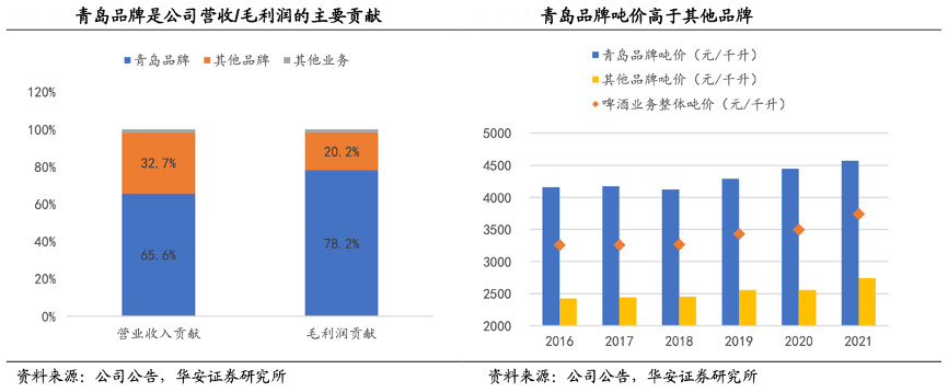 經(jīng)典案例:根據(jù)公司公告、華安證券研究所等綜合資訊表明,青島啤酒定位高端國產(chǎn)啤酒品牌,在國內(nèi)外市場享有較強(qiáng)品牌影響力。青島啤酒產(chǎn)品主要位于 5 元以上中高端價格帶,嶗山等其他品牌產(chǎn)品則主要提供 5 元以下的大眾型啤酒產(chǎn)品,因此青島啤酒的噸價及盈利能力均高于其他品牌。2021年青島品牌噸價為 4573 元/千升,毛利率為 43.8%。