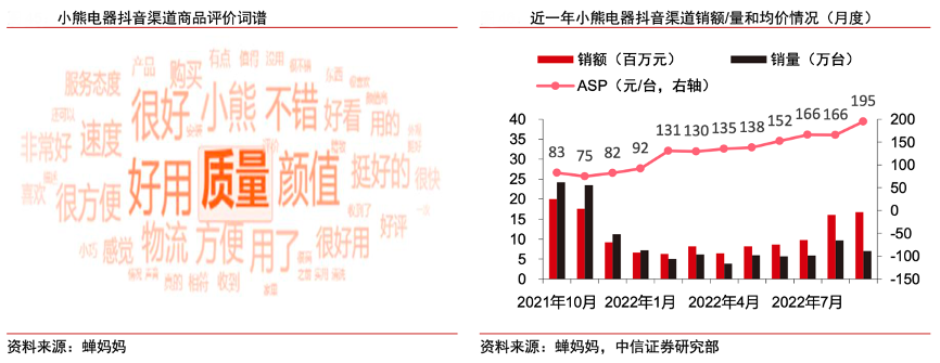 經(jīng)典案例:根據(jù)蟬媽媽、中信證券研究部等綜合資訊表明, 22H1小熊公司小家電產(chǎn)品抖音渠道 銷額/量分別約為0.45 億元/35 萬(wàn)臺(tái),均價(jià)為 128 元/臺(tái),預(yù)計(jì)公司抖音渠道收入占比大概為 2%。ASP穩(wěn)步提升,從 2021 年 11 月的 最低點(diǎn)約 75 元/臺(tái)上升至 2022 年 9 月的約 195 元/臺(tái),此趨勢(shì)與公司精品化產(chǎn)品戰(zhàn)略相吻合,聚焦于高質(zhì)量發(fā)展,調(diào)整產(chǎn)品結(jié)構(gòu),提升毛利中樞。