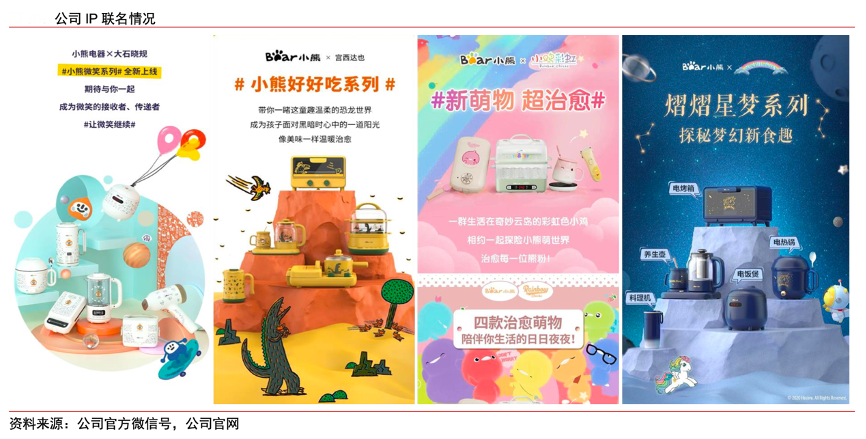 經(jīng)典案例:根據(jù)公司官方微信號(hào)、公司官網(wǎng)、中信證券研究部等綜合資訊表明,小熊公司積極與知名 IP 聯(lián)名,為旗下小家電產(chǎn)品賦予年輕化符號(hào),包括與小馬寶莉(My Little Pony)聯(lián)名推出“熠熠星夢(mèng)”系列和“綠野仙夢(mèng)”系列;與日本知名藝術(shù)家大石曉規(guī)(Akinori Oishi)推出“小熊微笑系 列”,品類覆蓋養(yǎng)生壺、電熱鍋、電飯煲等個(gè)性化的廚小電,有利于公司品牌知名度在年輕人群體中提高。