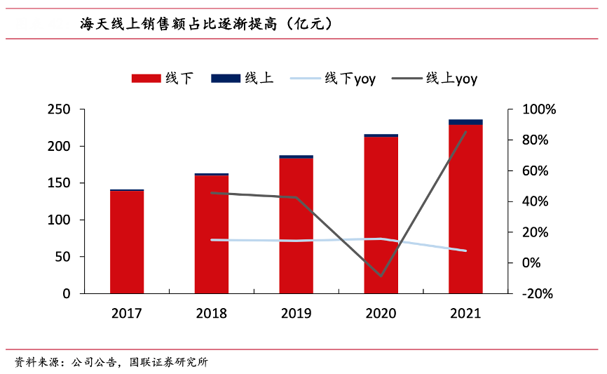 經(jīng)典案例:根據(jù)公司公告、國(guó)聯(lián)證券研究所等綜合資訊表明,海天公司線上銷售額穩(wěn)定增長(zhǎng),2021 年線上銷售規(guī)模達(dá)到 7.04 億元,同比增長(zhǎng) 85.2%,占營(yíng)收比重約 2.98%。海天適應(yīng)年輕消費(fèi)群體不斷變革的消費(fèi)習(xí)慣,順應(yīng)消費(fèi)新趨勢(shì),持續(xù)鞏固海天在新零售上的競(jìng)爭(zhēng)優(yōu)勢(shì)。