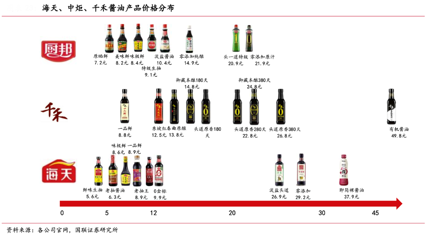 經(jīng)典案例:根據(jù)各公司官網(wǎng)、國(guó)聯(lián)證券研究所等綜合資訊表明,千禾以成為零添加醬油的第一品牌為目標(biāo),在業(yè)內(nèi)首次推出“零添加”醬油產(chǎn)品。其向上布局有機(jī), 向下布局高鮮,產(chǎn)品矩陣和價(jià)格帶逐漸拉長(zhǎng)。高鮮醬油補(bǔ)位10-15 元/500ml 價(jià)格帶,輔助零添加產(chǎn)品進(jìn)行市場(chǎng)推廣。有機(jī)醬油重塑高端天花板,有機(jī)醬油和天元有機(jī)的指導(dǎo)價(jià)分別 49.8 元/500ml,298 元/500ml。