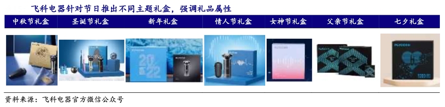 經(jīng)典案例:根據(jù)飛科電器官方微信公眾號、開源證券研究所等綜合資訊表明,飛科電器在 2021 年父親節(jié)、“618”、七夕、“818”等多個節(jié)日和平臺活動期間 位列品牌和類目榜單第一,創(chuàng)造多項個護電器抖音自播新記錄。同時針對節(jié)日推出主題禮盒款,與節(jié)日很好契合,充分體現(xiàn)個護產(chǎn)品的禮品屬性。