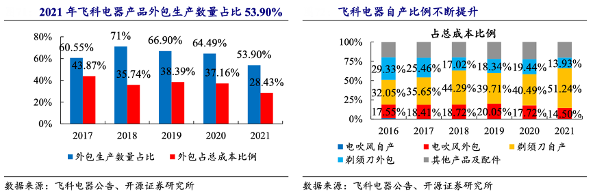 經(jīng)典案例:根據(jù)飛科電器公告、開源證券研究所等綜合資訊表明,飛科電器產(chǎn)品外包生產(chǎn)數(shù)量占總產(chǎn)量的比例自2018 年以來呈現(xiàn)下降趨勢,從 71%降到 53.90%。從成本角度看,2021 年電吹風(fēng)/剃須刀外包成本不斷下降,剃須刀自產(chǎn)比例不斷提升,2021 年電動剃須刀自產(chǎn)占總成本的比例為 51.24%,2020 年電動 剃須刀自產(chǎn)占總成本的比例為 40.49%。