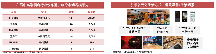 經(jīng)典案例:根據(jù)公司招股書、中信證券研究部等綜合資訊表明,亞朵布局中高端酒店行業(yè)快車道,細分市場規(guī)模領先,同時引領多元化生活方式。