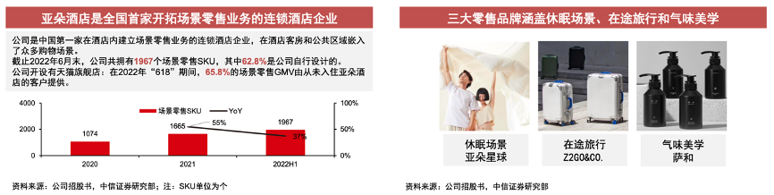 經(jīng)典案例:根據(jù)公司招股書、中信證券研究部等綜合資訊表明,亞朵酒店是全國首家開拓場景零售業(yè)務(wù)的連鎖酒店企業(yè),以三大零售品牌涵蓋休眠場景、在途旅行和氣味美學(xué)等方面。