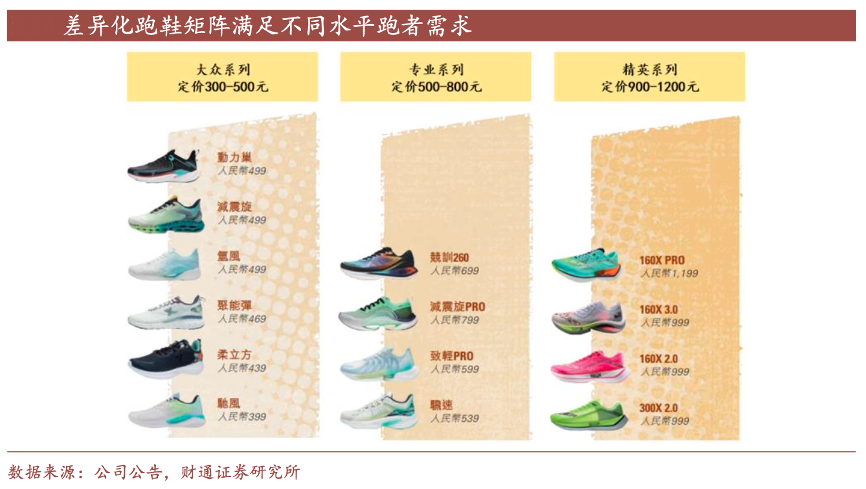 經(jīng)典案例:根據(jù)公司公告、財(cái)通證券研究所等綜合資訊表明,針對入門跑者特步公司推出了可以滿足消費(fèi)者舒適感需求的大眾系列跑鞋,定位 300-500 元價格帶;針對養(yǎng)成跑步習(xí)慣或需要滿足日常訓(xùn)練需求的跑者,公司推出兼具功能和舒適感的專業(yè)系列跑鞋,定位 500-800 元價格帶;針對專業(yè)競賽級跑者,公司推出推進(jìn)力、回彈、減震性能較高的精英系列跑鞋,定位 900 元以上價格帶。三大系列可以滿足不同專業(yè)度、不同消費(fèi)能力的跑者需求,實(shí)現(xiàn)對客群較為全面的覆蓋。