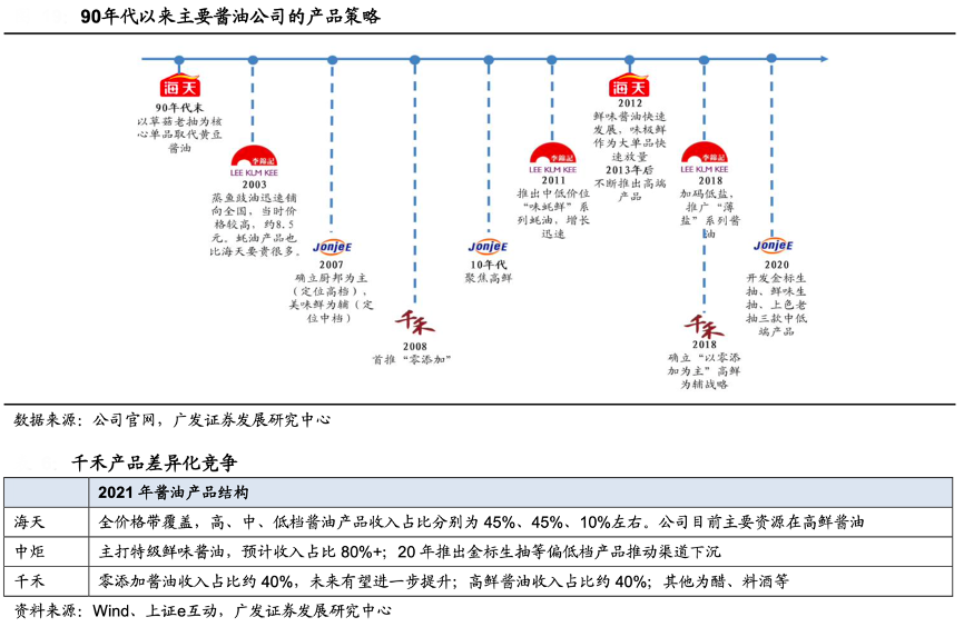 經(jīng)典案例:根據(jù)公司官網(wǎng)、wind、上證e互動(dòng)、廣發(fā)證券發(fā)展研究中心等綜合資訊表明,千禾味業(yè)率先布局高端醬油,獲得先發(fā)優(yōu)勢。2018年,公司進(jìn)一步確立了“零添加為主,高鮮為輔”的差異化產(chǎn)品戰(zhàn)略,資源主要集中于零添加醬油,高鮮醬油作為策略產(chǎn)品通過低定價(jià)放量,與其他公司“主做中低端,高端主打高鮮”的戰(zhàn)略有所差異,形成差異化競爭。